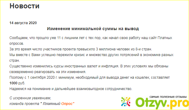 Во всяком случае, в сети есть немало людей, которые занимаются подобным. Я не собираюсь Вас ни убеждать, ни отговаривать от подобного заработка. А вот предостеречь о сайтах- мошенниках, с которыми явно не стоит связываться, наверное, нужно. Одним из таких и является этот сайт, "Платный опрос". О нем в сети немало положительных отзывов, порядка 65%. Я и сам время от времени заполнял анкеты, присылаемые этим опросником, зарегистрировавшись на нем около 3 лет назад. Могу судить, как мне кажется, успел разобраться. Опросы приходят редко, даже по сравнению с другими опросниками. Очень часто Вы не попадете в нужную им категорию опрашиваемых и после того, как Вы потратите минут 20 и почти полностью заполните анкету, Вам придет: - "Извините, не подходите". Нормальные сайты определяют это быстро, не заставляя напрасно терять время и даже многие предлагают хоть маленькую, но компенсацию за непройденный опрос. Здесь даже пройденный зависает до тех пор, "пока его не проверит заказчик". Иногда начисляют, чаще -нет. Никогда не знаешь. И простор для мошенничества отличный. Мутная контора. В довершение всего, по ходу меняют правила. Почти год у меня копилась необходимая для вывода минималка в 300 рублей. Зарегистрировался ири года назад, пару раз выводил по 300 р, на то, чтобы их собрать, уходит около года. Да нет, я не идиот, сидел на нескольких одновременно, и со многих уже неоднократно выводил денежку. Ну, и этот был, до кучи. Зашел на сайт, и вот, пожалуйста:
