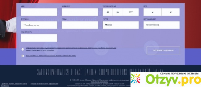 Но самое главное - действия на сайте. Для вступления в закрытый клуб нужно заполнить анкету, где, кроме обычных данных, нужно указать телефон и марку сигарет. Некоторые могут посчитать это навязчивым, но я считаю, что это показатель ответственности компании перед своими клиентами. Конечно, можно ввести некорректные данные, но это уже на совести каждого.