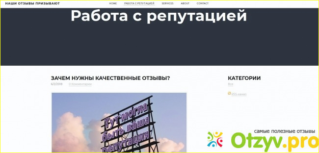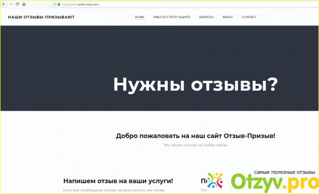Сайт "Призыв-Отзыв" (носит полушуточное название носит сайт, чуть ниже станет ясно, почему) занимается так называемой работой с репутацией в Интернете: образцы отзывов публикуются на самом сайте в качестве "затравки", на одном из разделов сайта помещаются бизнес-статьи о различных подходах к рекламе, к написанию отзывов и некоторые рассуждения посвящены тому, как эти самые отзывы воспринимаются