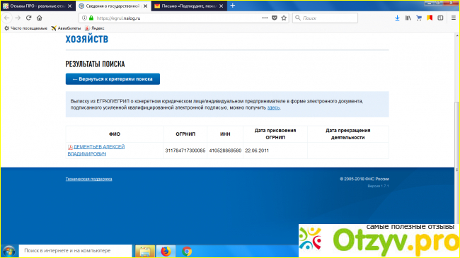 Итак, вернемся опять к сайту. Спустившись вниз, мы видим номер ОГРН и данные его владельца, здесь указан ИП Чернышев Павел Вячеславович. Далее мы копируем номер ОГРН и на сайте налоговой инспекции вводим этот номер и уже его владелец другой человек.