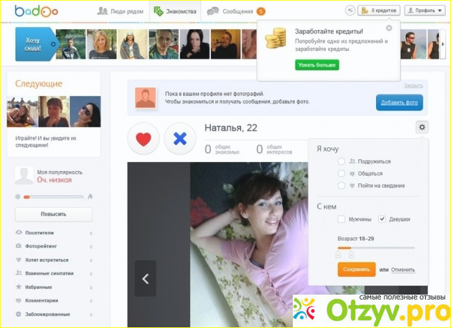 И вот мы прошли небольшую процедуру регистрации, после чего нам доступен интерфейс сайта, он достаточно удобный, но вот найти кого-то по определенным критериям тут просто не возможно. Есть лишь функция Люди рядом и все. Поэтому перед вами появляются анкеты с фотографиями, вы можете поставить плюсики, что мол вам данный человек симпатизирует, и если ответ будет абаюдным вы можете приступать к общению. Но опять же нужно привлечь внимание собственно на сами анкеты, большинство из них явно искусственно созданы, достаточно приглядеться на фотографию собеседника и станет понятным, что фотографии просто скачаны с интернета.