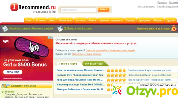 Одним из вариантов зарабатывания денег на написании отзывов является сайт Айрекоменд. Здесь, как и везде, имеются свои плюсы и свои минусы. Плюсы в том, что данный сайт регулярно выплачивает деньги тем, кто на нем работает. Минусы состоят в том, что здесь, как и на Отзовике, выплата осуществляется только лишь на Вэб Мани кошелек. Еще люди видят минусы в том, что не на все объекты можно писать отрицательные отзывы, иначе можно попасть в бан.