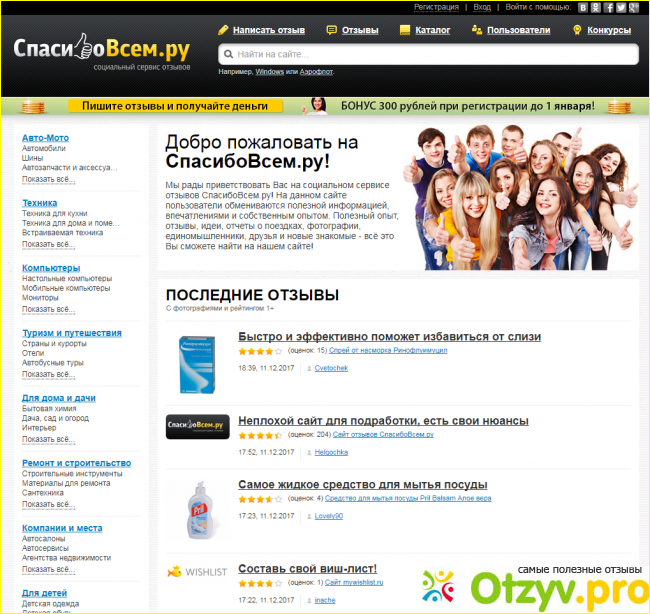 Данный сайт отзывов, наверно, самый худший из всех, с которыми приходилось иметь дело. Да и название сайта, как оказалось, говорящее. Здесь вместо выплаты говорят "Спасибо Всем" и будь здоров! Выплата здесь от 500 рублей, как и на многих сайтах. При регистрации же дают 300 рублей, но... За сами отзывы бонусы вы не получаете, а доход будет лишь только от просмотров, которые здесь оценены всего лишь в 10 копеек. Следовательно, чтобы получить ваши первые 500 рублей, вам надо будет очень сильно постараться. Кроме того, какими-то неведомыми путями здесь узнают, кому из родственников и знакомых вы регулярно скидываете ссылки на просмотр ваших отзывов. И когда вы в итоге постараетесь вывести ваши первые 500 рублей, вам скажут, что якобы они нечестно заработаны и все ваши труды, соответственно, насмарку.