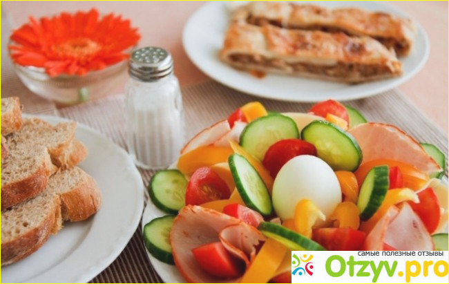 большой стакан воды, тарелка зеленого салата, 100 гр нежирного творога, 1 отварное яйцо и пару кусочков цельнозернового хлеба