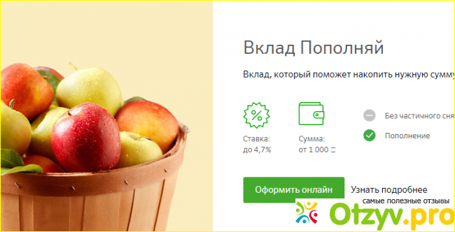 Пополняй – менее доходный вариант, можно внести деньги в банк на срок от трёх месяцев, до трёх лет и при этом сумма вклада может начинаться от одной тысячи рублей. Максимальный процент по такому вкладу составляет четыре целых и семь сотых процентов. Максимальный процент можно получить, воспользовавшись онлайн сервисом, но не рекомендую этого делать, просто потому, что можно ошибиться в оформлении и получить не тот результат, который хотелось бы.