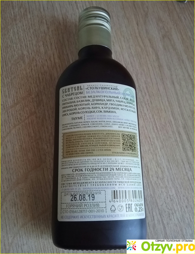 Срок годности сбитня 12 месяцев со дня его изготовления, а судя по дате изготовления путем горячего розлива, указанной производителем на обратной стороне бутылочки, изготовлен сбитень 26.08.2019 года.