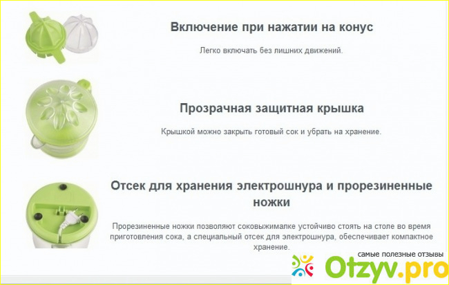Долго не выбирали, решение приняли быстро. Два факта повлияли на наше решение. Первое – это цена. Она оказалась очень приемлемой. А в то время в магазине еще была и акция, что нас убедило окончательно. Второй факт – вполне пристойный дизайн. Соковыжималка компактная, симпатичная и веселенькая. Красивые салатового цвета детали в сочетании из прозрачным пластиков создают приятную картинку. Хорошо смотрится соковыжималка на кухонном столе.