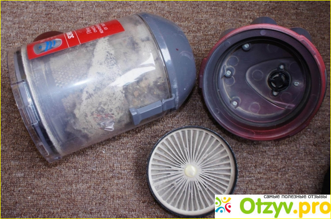 Пылесос не сильно мощный – около 1700 Вт. Пыль стал поглощать довольно таки хорошо, но это касалось только первой чистки. При заполнении контейнера на пятую часть (всего то!) всасывающая способность начинает резко падать. А сколько пыли собралось в контейнере можно легко увидеть, поскольку он выполнен прозрачным. Когда объем доходит до третьей части, то сосать он вообще почти перестает. Пылесос снабжен двумя фильтрами. Один фильтр защищает мотор, чтобы тот не засорился, а второй отфильтровывает воздух на выходе. Фильтр на мотор следует промывать при каждой чистке контейнера, поскольку он очень сильно забивается. Промывать его не очень трудно, но и не легко, приходится использовать спичку, чтобы прочистить складочки на тканевой гармошке. Второй фильтр практически не забивается, поэтому его мыть приходится очень редко. Сам контейнер легко разбирается и собирается.