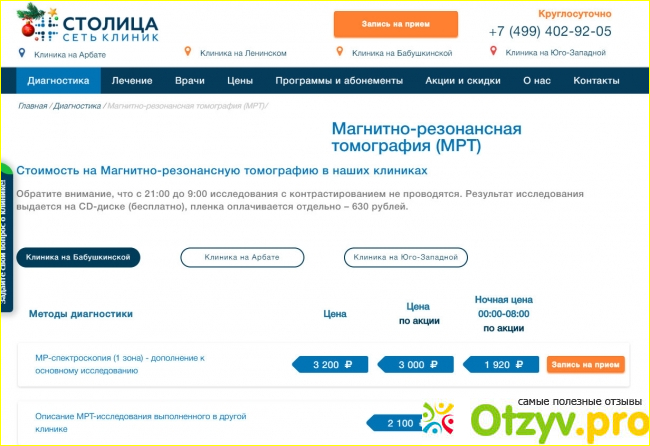 В Москве сделать МРТ предлагает сеть клиник "Столица". В систему медучреждений входят клиники, которые находятся на Арбате, на Ленинском, на Бабушкинской и на Юго-Западе столицы.