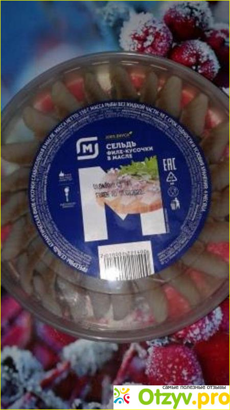 Ровные кусочки филе сельди. На фото видно, как она положена. Она только в Магните. Под брендовой маркой Моя цена. Пряности и соль в меру. Не сильно соленная. Маслом залита она.