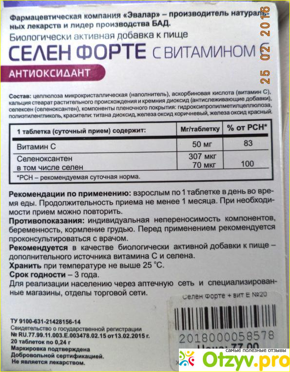 Продается селен в картонной упаковке, в таблеток. Оборотная сторона упаковки очень информативна: на ней указаны данные о производителе, рекомендации по применению и состав.