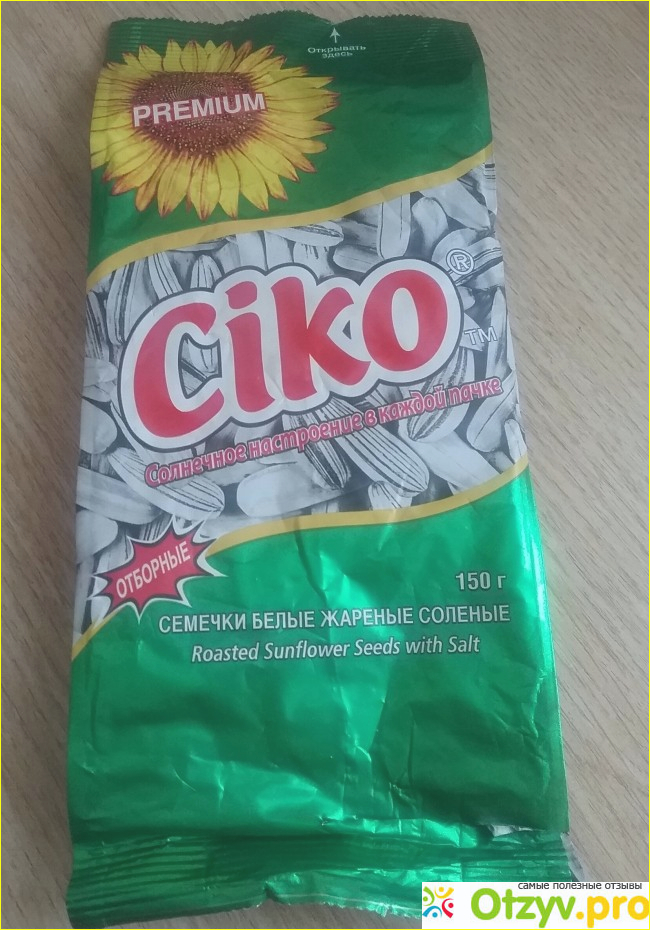 При вскрытии упаковки установлено, что все семена белого цвета, длинные, на некоторой кожуре семян имеются тонкие полоски черного цвета. Семена тонкие, приплюснутые, с заостренным кончиком. Несмотря на то, что семечки длинные и некоторые достигают 2-3 см в длину, но внутри них семена намного меньше в размере. Из всей упаковки мне лично ни одной пустой семечки не попало. Все кожурки сверху шероховатые, соленые. Соли положено в меру и они не кажутся пересоленными. Соль, добавленная при жарке, придает семенам особый вкус. Но сами семечки не соленые и солоноватый вкус семена приобретают за счет кожуры. Кожура у семечек не толстая и семечки хорошо и легко грызутся. На вкус семена подсолнечника вкусные, в меру жареные, пережаренных и прелых семечек не встречалось.
