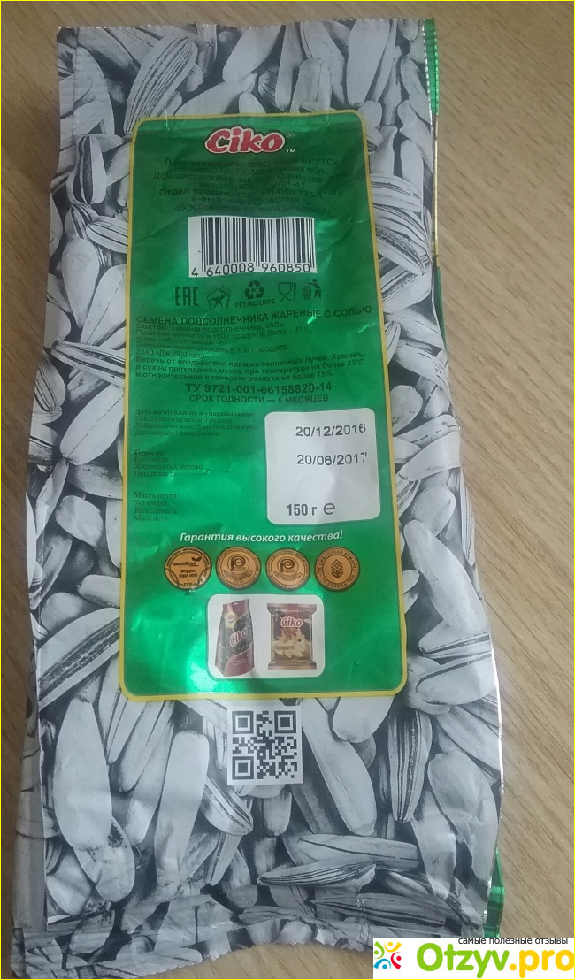 Я была удивлена данной покупке, так как соленые белые жареные семечки мы ни разу не покупали. Правда такие семечки очень любит наша племянница и постоянно покупает их. Муж, находясь в магазине, взял с прилавка первую попавшуюся упаковку с семечками, не зная, что они белые и соленые, так как не рассматривал их. Всего в упаковке расфасовано 150 грамм семян подсолнечника, которые пожарены с солью. Срок годности семян составляет 6 месяцев со дня их изготовления.