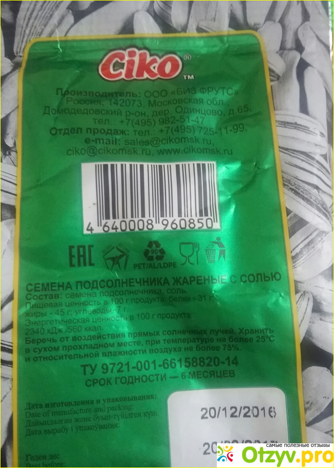 В основном я постоянно покупаю черные семена подсолнечника. Мне почему- то они нравятся больше. Несколько дней тому назад муж пошел в магазин за продуктами питания и купил мне семечки. Когда я увидела упаковку, то обнаружила, что семечки были белые, жареные и соленые. Изготовлены семена подсолнечника ООО "БИЗ ФРУТС", Россия, Московская область, Домодедовский район, дер. Одинцово.