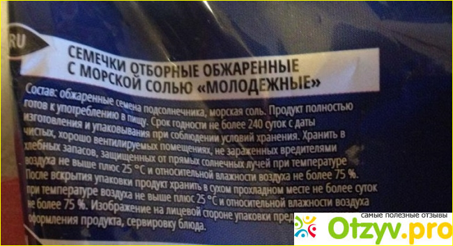 В составе обжаренные семена подсолнечника и морская соль.Продукт полностью готов к употреблению, срок годности не более 240 суток с даты изготовления и упаковывания при соблюдении условий хранения.