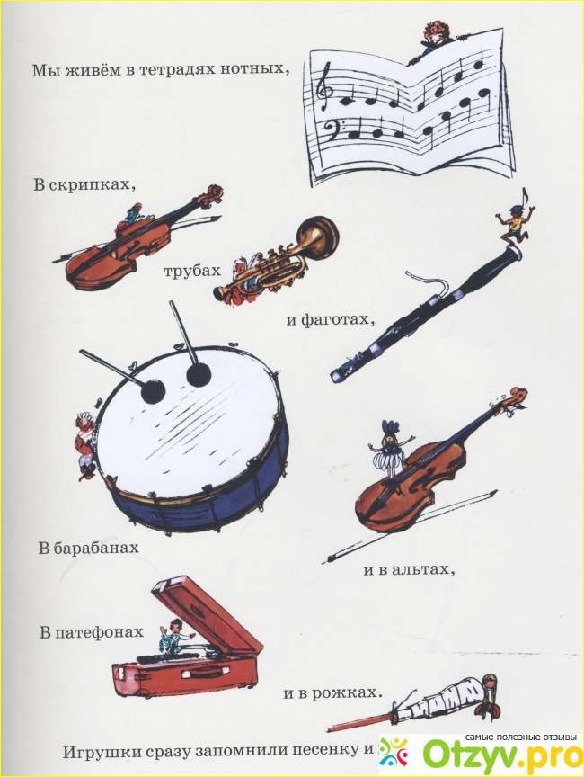 Прекрасные яркие иллюстрации Ф. Лемкуля помогают читателям представить события, изложенные в сказке, и запомнить названия нот и музыкальных инструментов.