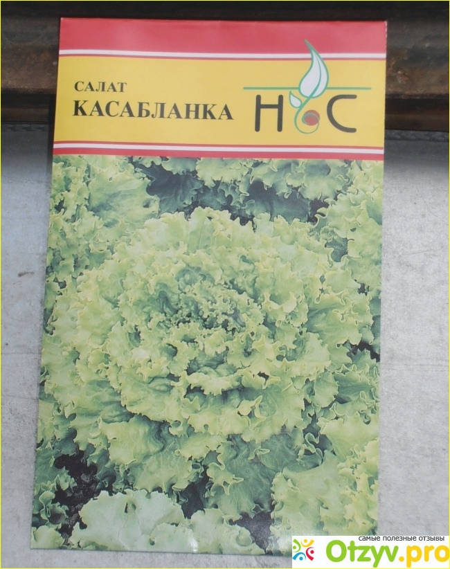 Пакетик с семенами обычный - бумажный, гладенький, по верху идет красно-желтая полоса, на которой написано "салат Касабланка" и нанесена аббревиатура - НС, которая расшифровывается как - Новые семена. А вот большую часть упаковки занимает рисунок, где изображены большие розетки салата - зеленые, кудрявые, красивые. Глядя на такую картинку, хочется посадить и вырастить такой салат.