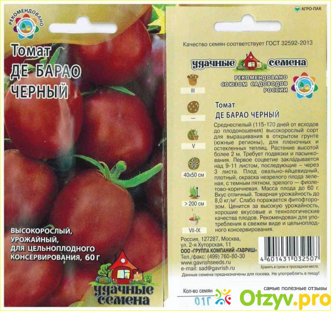 С точки зрения сорта: сорт отменного гастрономического качества, просто легенда нашего огорода. В 95 процентах, в зрелом виде вы получите очень вкусные, не суховатые, но в тоже время тверденькие (на консервации) калиброванные помидорки, по 40-50 мм длины, овальные, темно красного цвета. Отмечу, что и красный "стандартный" Де-Барао не плох, но черный отличается более насыщенным вкусом и ароматом, да тем самым ароматом, выращенных на открытом воздухе помидор.