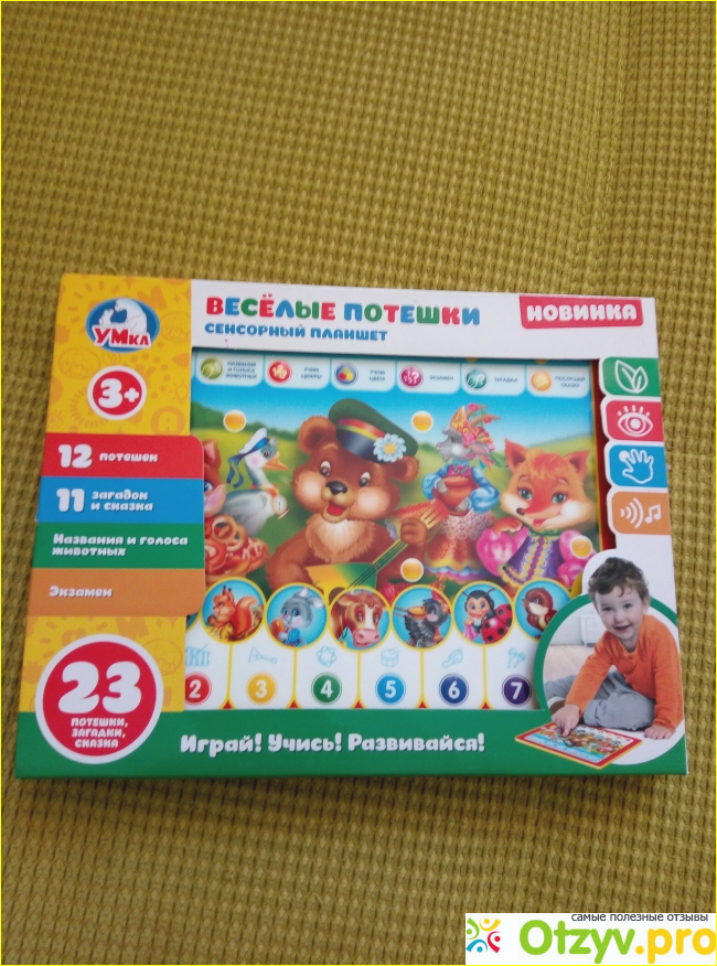 Вчера были друзья и подарили сыну вот такой чудный планшет. Он для ребёнка и дарит столько положительных эмоций и интересов, что мне самой захотелось в нем разобраться и поиграть. Игрушка рассчитана на детей с 3 лет и ей можно играть учиться на нем уму разуму. Основные программы планшета детского в том, что он имеет функции. 12 потеряшек, 11 загадок. Читает ребёнку сказку. Можно изучить голоса животных. Сдать экзамен. Узучить цифры, цвета.
