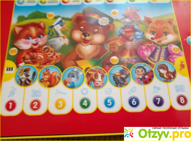 Музыкальная составляющая в игрушке это звуки музыканых инструментов. Одни из популярных маракасы, балалайка, труба, барабан, гармршка, бубен и прочее. А ещё планшет можно использовать для игры на фортепиано. Клавиатура. Очень здорово и этим самым развить слух ребёнку.