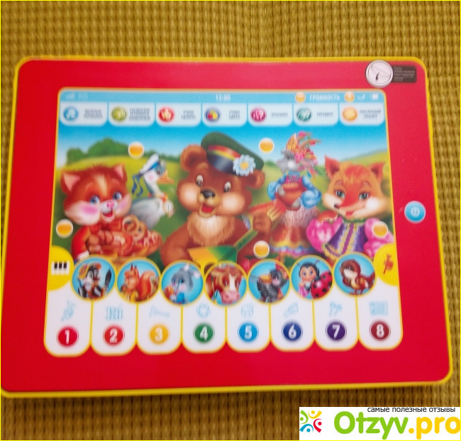 Работает планшет от нажатия пальцем по нужной кнопке. Есть функции настройки громкости, ее можно добавить и убавить. Присутствует функция включения и выключения планшета. Версия планшета, только в виде игры и занятий для детей дошкольного возраста.