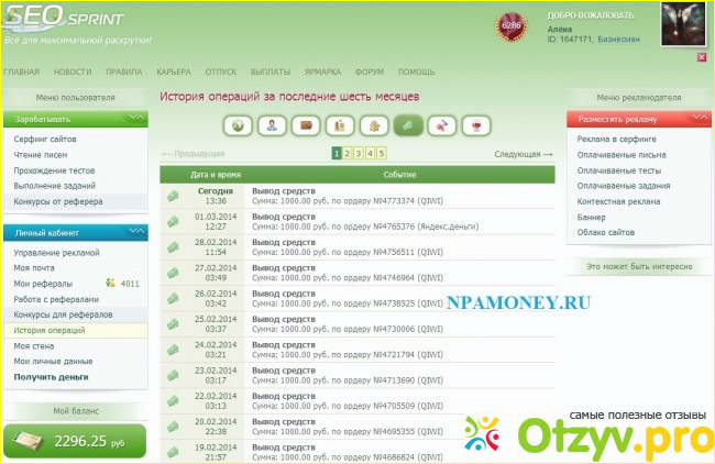 Сайт для пассивного дохода сеоспринт определенно не является разводом, не требует с вас материальных вложений. Работа довольно простая и заключается на кликании отзывов, просмотре, прохождении тестов. За два часа непрерывной работы заработать получается максимум один рубль (!) с выводом денежных «средств» на электронный кошелек вебмани.