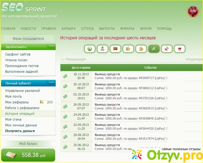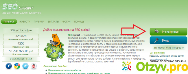 seosprint.net — это самая знаменитая рекламная площадка в рунете. Сайт работает уже более трех лет. За это время зарегистрировалось почти два миллиона человек, причем наблюдается стабильный прирост пользователей с каждым днем. За все время пользователям было выплачено более тридцати миллионов рублей. Данный проект работает стабильно, без сбоев. Отдельным плюсом можно отметить автоматические выплаты, хотя есть и возможность выводить деньги вручную. Вывод осуществляется на любой удобный для вас электронный кошелек.