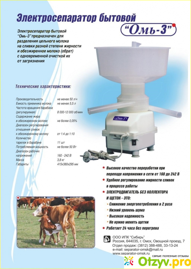 Хорошие скидки, условия оплаты очень удобные, оптимальный сервис и логистика. Уход и эксплуатация : при правильном эксплуатации и очистки прибор служит долго. Срок службы больше 10 лет, это достойный срок для того аппарата. для промывки после окончание сепарирования молока, необходимо влить около трех литров воды желательно тёплой, не в коем случае не горячей и пропускаем её. Пропускаем её через сепаратор, включенный это нужно для удаления остатков сливок и обрата. О времени если аппарат работает непрерывно не более одного часа, то сепаратор необходимо выключить на минут 20 - 30 мин, это нужно для охлаждения. Хочется сказать спасибо тем людям, которые внесли свой профессиональный труд на этапах производства сепаратора для молока. По моему мнению это классная вещь. Рекомендую её тем, кто заботится о своём здоровье, здоровье своих детей, родных и близких, и старается употреблять только полезные продукты. Отличный подарок на любой праздник, как для себя, так и для своих родных и близких друзей.