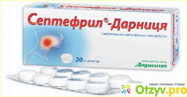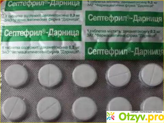 Активным веществом Септефрила является декаметоксин. Среди вспомогательных компонентов - сахароза, крахмал, повидон и стеарат кальция.