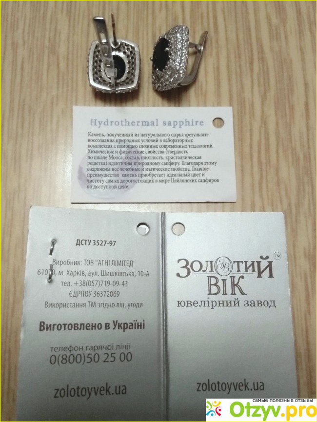 Это изделие из серебра 925 пробы, с гидротермальными сапфирами и россыпью из кубического циркония. Вес изделия 5,31 гр, 2 гидротермальных сапфира - 2,6 карата, цирконий 136 шт.