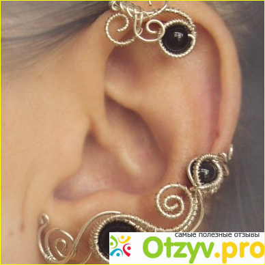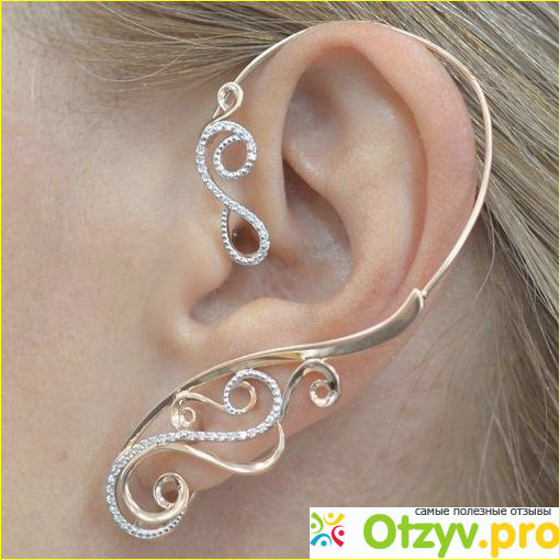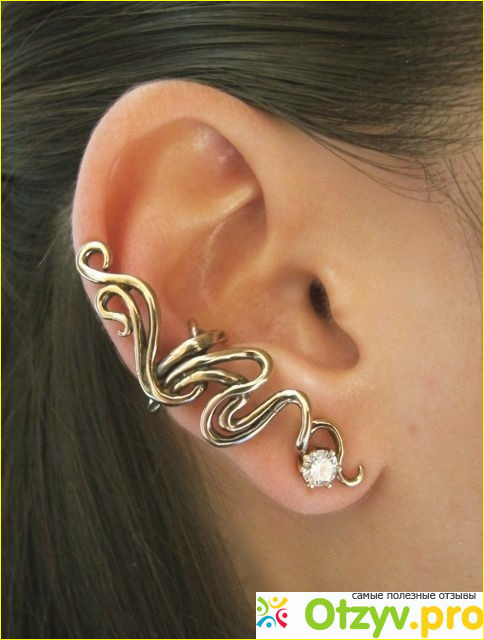 Как я уже и говорила - каффы это серьги которые одеваются практически на все ухо. Обычно каффы идут не полностью на все ухо, а лишь тянутся вдоль его мочки и на самый верх уха. Причем особенностью этих сережек является то, что есть такие модели которые можно одевать даже и без прокола ушей.