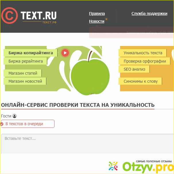 Сегодня мой отзыв касается онлайн-площадки Text.ru. По большому счету это – биржа копирайтинга, на которой можно зарабатывать деньги своим литературным трудом. Однако проверить такие работы на уникальность здесь могут не только зарегистрированные пользователи, но и все желающие. Разница не в качестве анализа, а во времени, в течение которого осуществляется поиск плагиата, либо отсутствие такового.