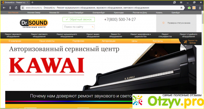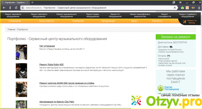 Для начала хочу рассказать о компании, начали они работать в двух тысячи десятом году, и на данный момент занимает хорошую позицию в сфере профессиональных услуг, а именно по ремонту, диагностике и обслуживанию звукового оборудования. Также на данном сайте предусмотрено, что работают профессионалы, тщательно отбирают сотрудников, плюс ко всему проходят квалификацию. Обещают качественно и на высшем уровне выполнять свою работу, как только заходим на данный сайт, имеется информация о самой компании, также раздел наши клиенты, портфолио, авторизации, имеются плюс ко всему цены, можно связаться с ними, предоставлены номера.