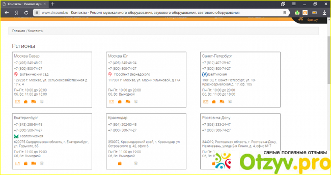 Когда работают и где находится сервисный центр. Также показано где находятся: вся Россия, Москва Юг, Москва Север, Санкт-Петербург, Екатеринбург, Краснодар, Ростов-На-Дону, Казань и Оренбург. Производят они ремонт звукового оборудования, а именно ремонтируют: динамики, акустические системы, также звуковую, усилители мощности. Имеется раздел ремонт светового оборудования, а именно ремонт световых эффектов, аксессуары для световых оборудования, ремонтируют световые головки, также управления светом, прожекторов, сканеров, зеркальные шары, лазеры и фермовые конструкции. Плюс ко всему имеется раздел: ремонт музыкального оборудования, а именно ремонт гитарного оборудования, клавишных инструментов, электронных, ударных инструментов и ремонт гитар. Также имеется раздел: ремонт видео оборудования, а именно кино театральные звуковые, процессоры, проекторы, ресивер и медиа плеер.