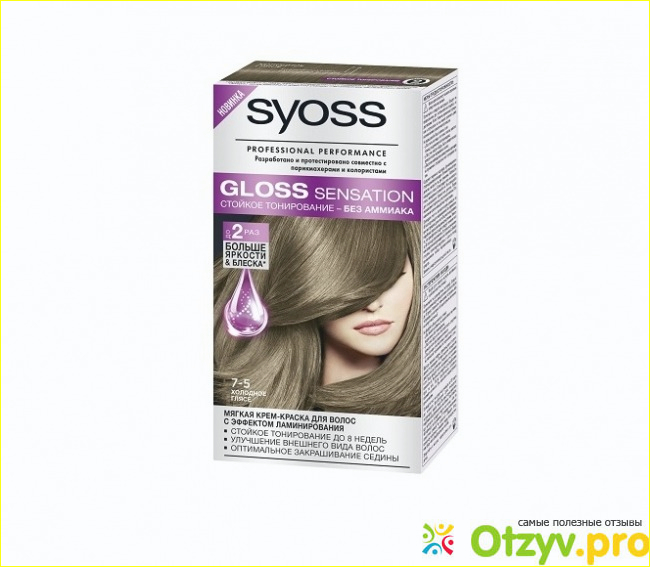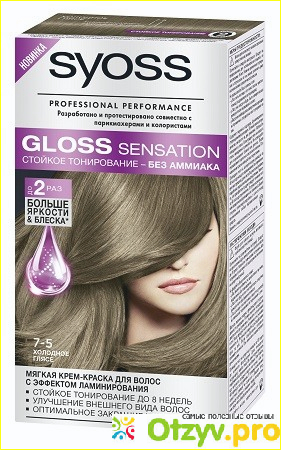 Но и это еще не все ее возможности. Сьес глосс сенсейшен 7-5 идет в очень привлекательном теплом оттенке гляссе, то есть это кофейный цвет, который по сути прекрасно подходит для любого типа кожи, отмечают то, что он не смывается так быстро, сам оттенок передается полноценно, тем самым закрашивается седина, получается вполне равномерный оттенок, то есть без разводов, все ложится единым слоем. Краска совершенное не портит волосы и их структуру, даже отмечают, что наоборот идет как бы питание и восстановление волос.