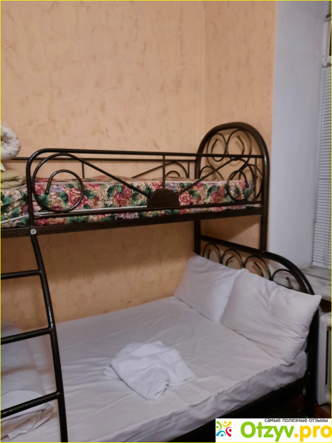 Большую часть номера занимает кровать. Номер чистый, белье белоснежное, есть два раскладных стульчика и раскладной стол, крючки для одежды. Мы с дочкой свободно разместились вдвоем на нижней кровати. На этаже есть оборудованная кухня. Чай, кофе, пользование посудой входит в стоимость проживания.