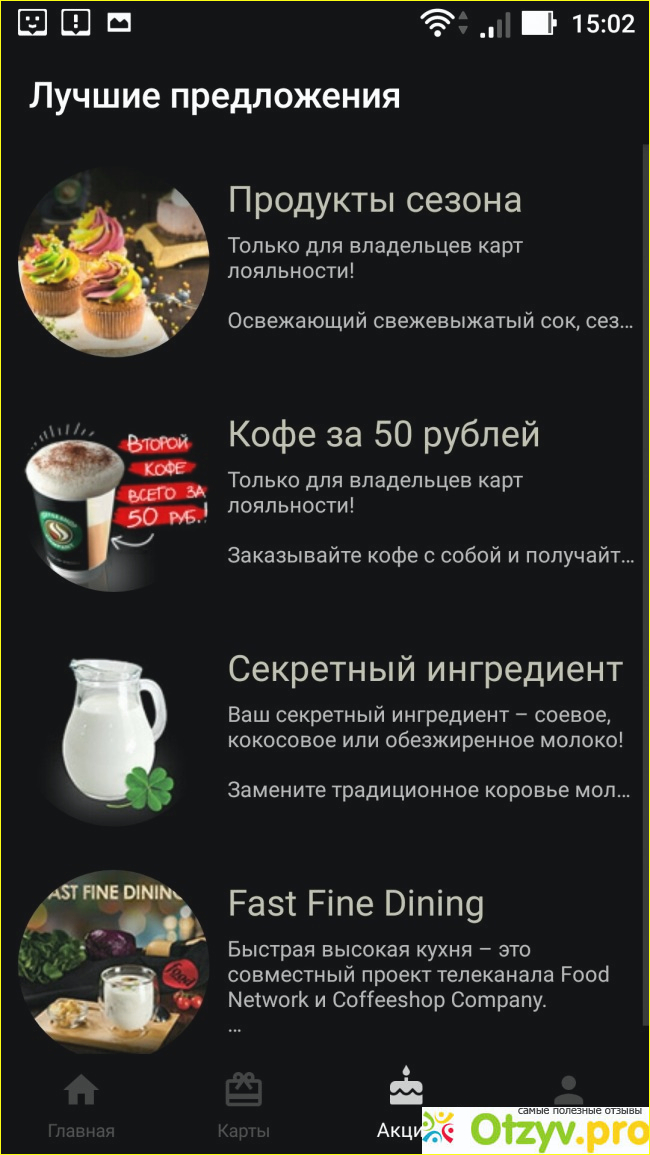 Кофейня делает скидки на сезонные предложения и кофе, есть и другие акции. Все они доступны только владельцам карты лояльности. Чтобы ее получить нужно заплатить. Есть возможность получать бонусы и скидки не заплатив ни копейки. Сотрудники кофейни об этом не рассказывают.