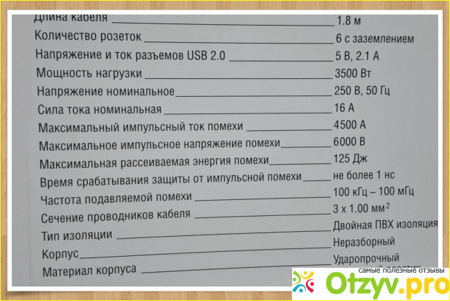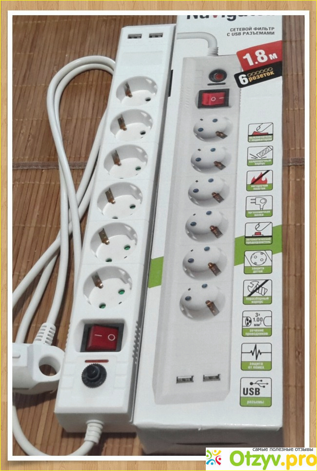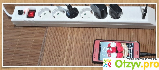 Шнур имеет двойную изоляцию, изготовлен качественно. С одной стороны фильтра установлены два разъёма USB. Использую я их, можно сказать, постоянно для зарядки наших телефонов и планшетов. На противоположной стороне есть клавиша включения и выключения прибора и чёрная кнопка с индикатором красного цвета, которая и срабатывает в нужный момент, защищая технику от перегорания.