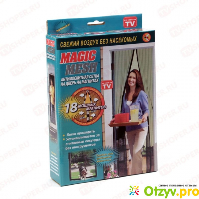 Мы живем в частном доме, так что нам была необходима антимаскитная сетка-штора на дверь. Мы с мужем выбрали «Magic Mesh» (Небо), ориентируясь как на цену данного приобретения (сетка обошлась нам в шестьсот девяносто рублей), так и на ее основные преимущества, к которым относятся: