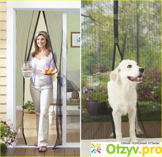 Москитная сетка включает в себя два полотна, оснащена она 18 вшитыми магнитами, с помощью которых сетка захлопывается прямо после того, как я через неё прохожу. Но при этом, она абсолютно не мешает проходить из помещения в помещение. Короче говоря, всё это происходит в автоматическом режиме. Не нужно делать никаких лишних движений, чтобы поправить шторку. А если дома есть животные, то не нужно будет каждый раз впускать или пускать их дом, они это сделать самостоятельно.