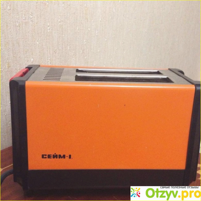 Сам тостер выполнен очень хорошо и качественно. В нем присутствуют как пластиковые так и металлические элементы. У меня он даже по чистой случайности один раз упал правда с не очень высокого места и все равно ему ничего не было. Выполнен же этот тостер в оранжево-черном цвете. А спереди с одной стороны на нем крупными буквами написано Сейм-1.