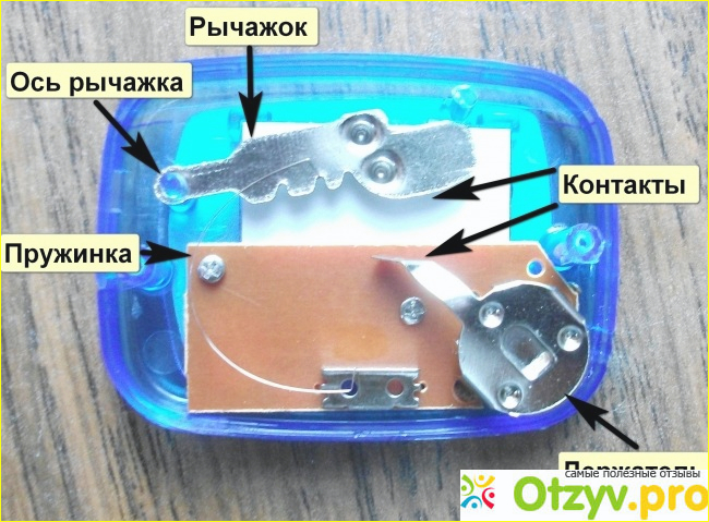 Внутри прибор устроен просто. Датчиком служит подпружиненный рычажок, при толчках, возникающих при ходьбе, он качается вокруг оси, периодически замыкая контакты, а электронная схема из счётчика и дешифратора переводит это в показания ЖК дисплея.