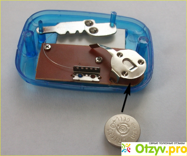Питание схемы осуществляется от "таблеточной" батарейки типа LR1130, заряда которой хватает примерно на 8 месяцев. Для того, чтобы сменить её, необходимо отвернуть два самореза на задней крышке, снять её, и, поддев чем-то, вытолкнуть батарейку из держателя.