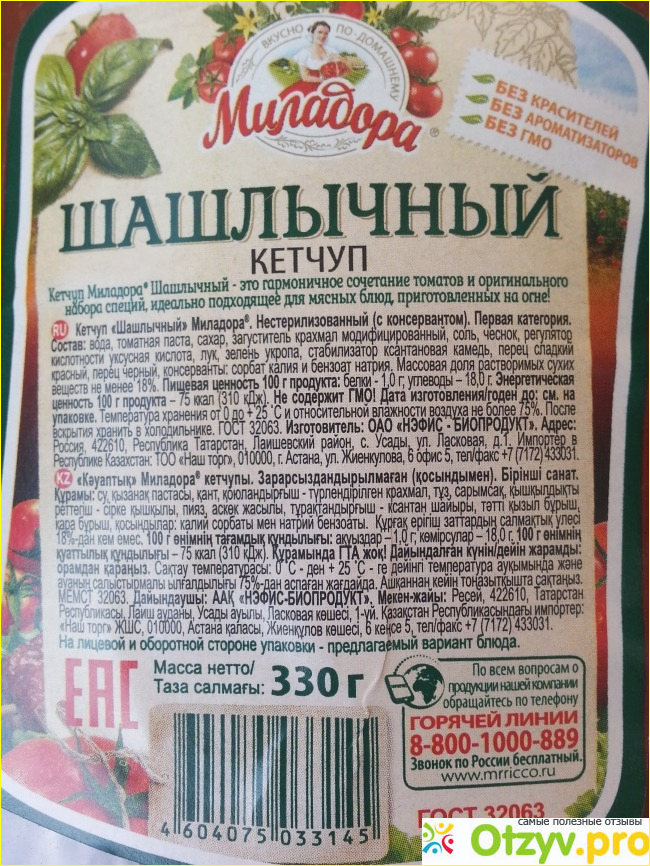 Еще одно делает честь производителю: номер бесплатного телефона горячей линии тоже дается крупно и четко (в нижнем правом углу на обратной стороне). Можно взять и позвонить по всем вопросам. У меня собственно есть одно предложение - выпускать кетчуп в большей емкости. 330 г - этого маловато для большой такой компании, собравшейся на шашлыки. Да и любителей пельменей при наличии одной бутылки должно быть не больше четырех. Если больше - то кому-то придется поскромничать.
