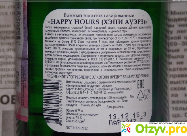 Да, бутылка выглядит довольно празднично и, безусловно, украшает любой праздничный сьол. Сразу обратил внимании на производителя - это ООО "Центр пищевой индустрии "Ариант" в городе Челябинске. Разу стало понятно, что данный напиток изготавливается из привозного виноматериала, так как виноград на Урале просто не растет. Между делом поинтересовался ценной данной бутылочке, оказывается бутылка такого напитка стоит всего 120 рублей. Согласитесь, что цена шикарная за бутылку шампанского, но почему же она такая низкая?