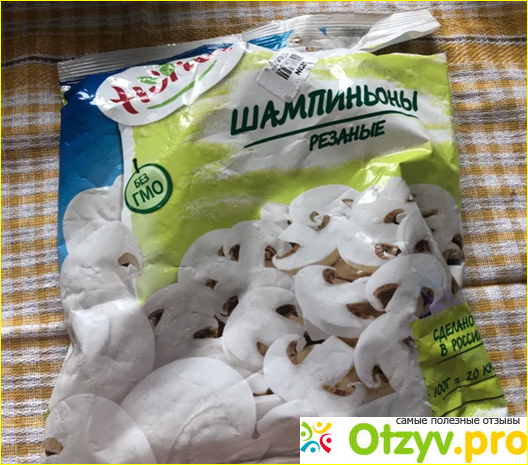 Именно поэтому я стала покупать уже готовые нарезанные шампиньоны замороженного типа. Так у мня в морозилке завалялся этот продукт от производителя «Hortex». Сегодня я решила его использовать для салата.