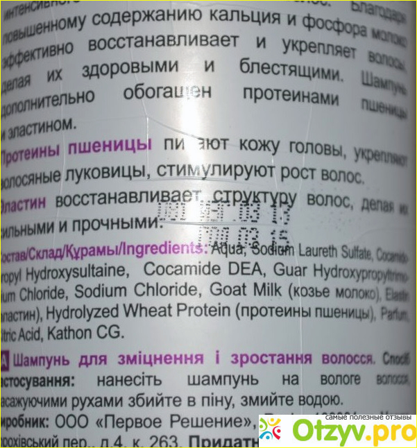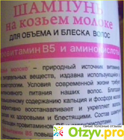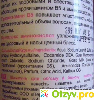 Сразу скажу, что я покупаю уже не первый бутыль этого шампуня, и пробовала уже как для укрепления волос, так и для объема. Оба средства хороши, и выглядят они идентично, разнится только надпись на лицевой стороне, именно предназначение. Ну и в шампуне на козьем молоке для роста и укрепления есть пшеничные протеины и эластин, а для объема и блеска – аминокислоты и провитамин В5.