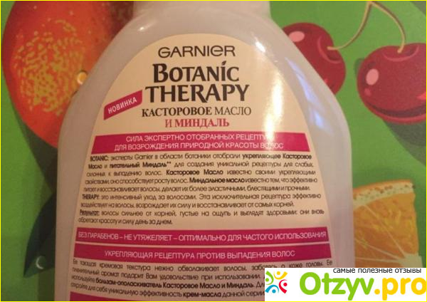 В шампуне находятся красители и силиконы. Они тоже не совсем положительным образом влияют на состояние волос. Но благодаря этим компонентам средство хорошо пенится, создается эффект гладких и послушным волос. А также шампунь имеет приятный цвет и аромат. Но все эти вещества ни каким образом не улучшают состояние локонов. А вот полезные масла и добавки, которые действительно могли повлиять на волосы находятся в самом конце. Это говорит о том, что их в шампуне совсем не много. Поэтому конечно же ждать чуда от шампуня Botanic Therapy Касторовое масло и миндаль отGarnier точно не стоит. Зато у некоторых людей он может вызвать зуд и раздражение на коже.