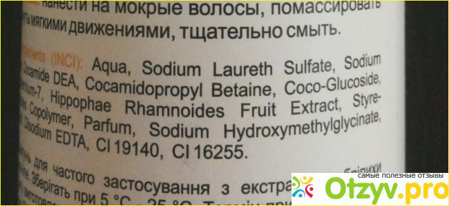 В составе шампуня есть комплекс активных веществ: облепиха, жирные кислоты, витамины А, С, Е, Р, К.