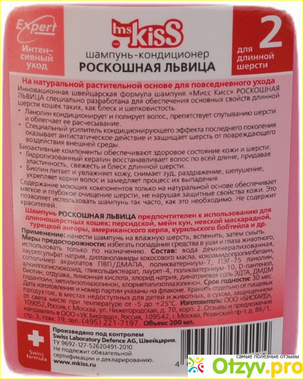 Шампунь этот стоит порядка 150-170 рублей и продается в пластиковых флакончиках объемом 200 мл. В серии продуктов Ms.KISS есть средства на разные случаи, но Роскошная львица предназначается для кошек длинношерстных пород, чья шерсть требует особого внимания и ухода.
